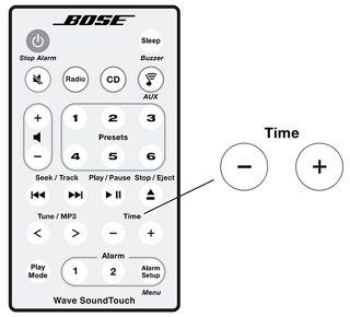 Halten Sie Time - oder Time + gedrückt, bis die angezeigte Zeit stimmt; je länger die Taste gehalten wird, umso schneller ändert sich die Zeitangabe.