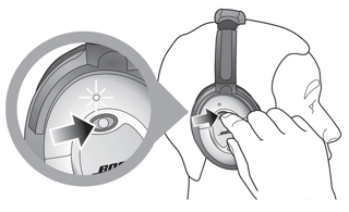 Setzen Sie die Kopfhörer auf. Schieben Sie den Ein-/Aus-Schalter an der rechten Hörmuschel in die Position „Ein“. Die Batterieanzeige leuchtet auf.